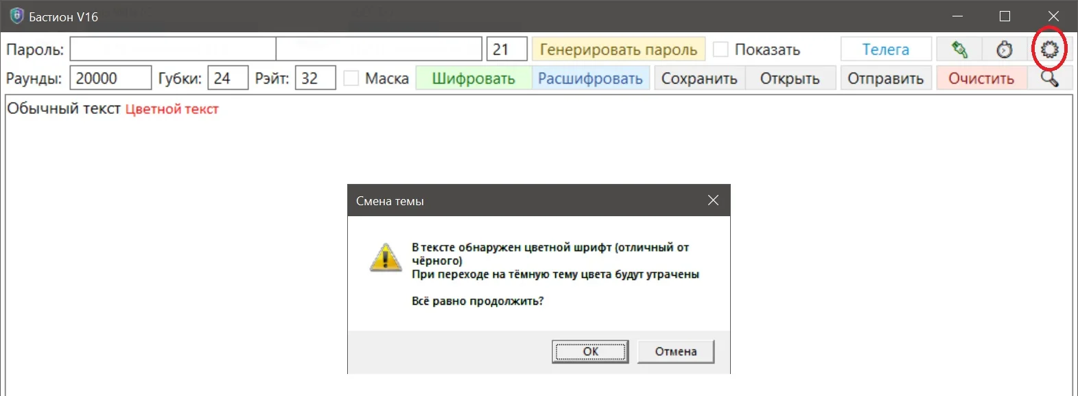 Добавлено предупреждение при переключении со светлой темы на тёмную, если в тексте присутствуют цветные шрифты.