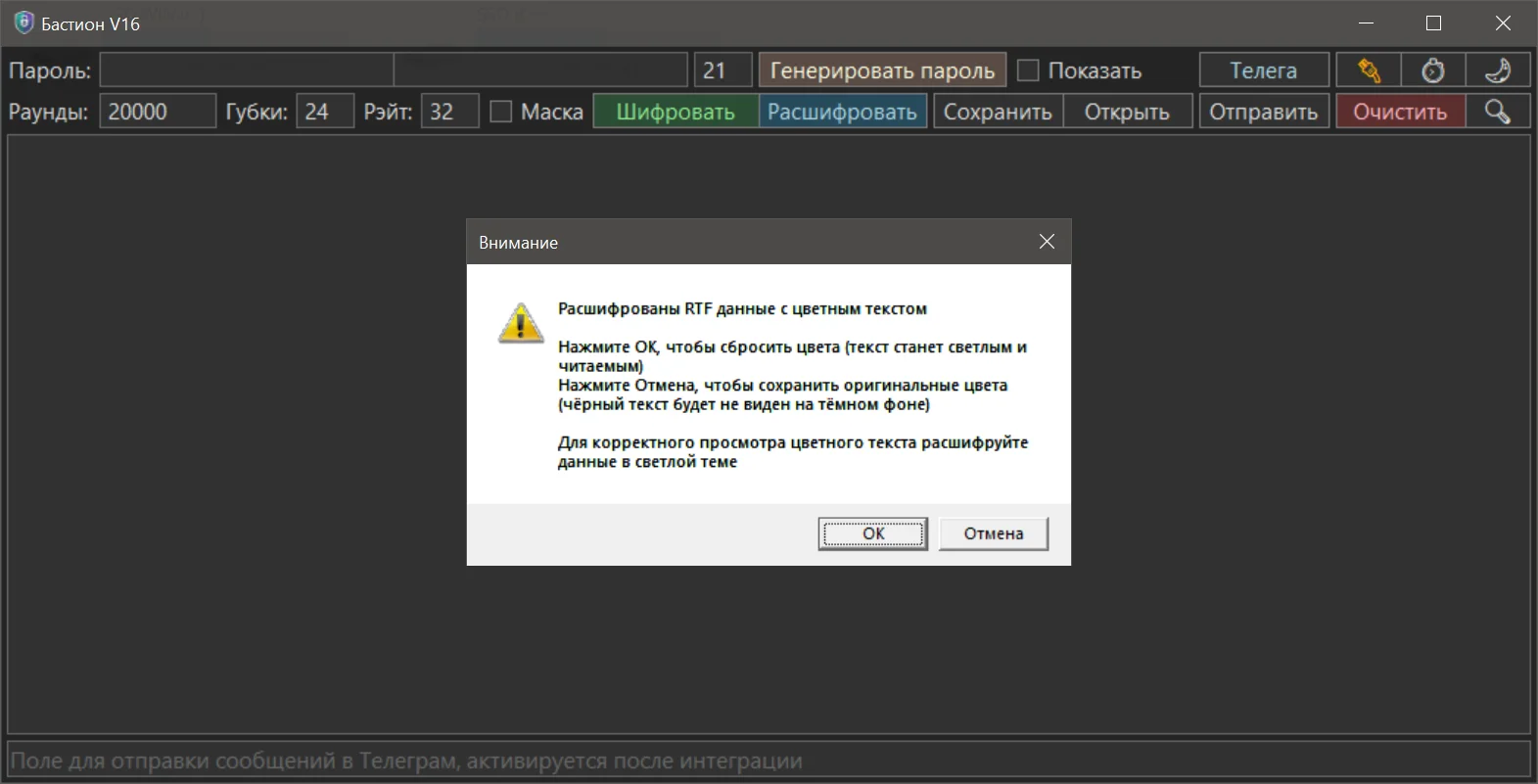 При расшифровке текста с цветовым форматированием теперь появляется предупреждение.
