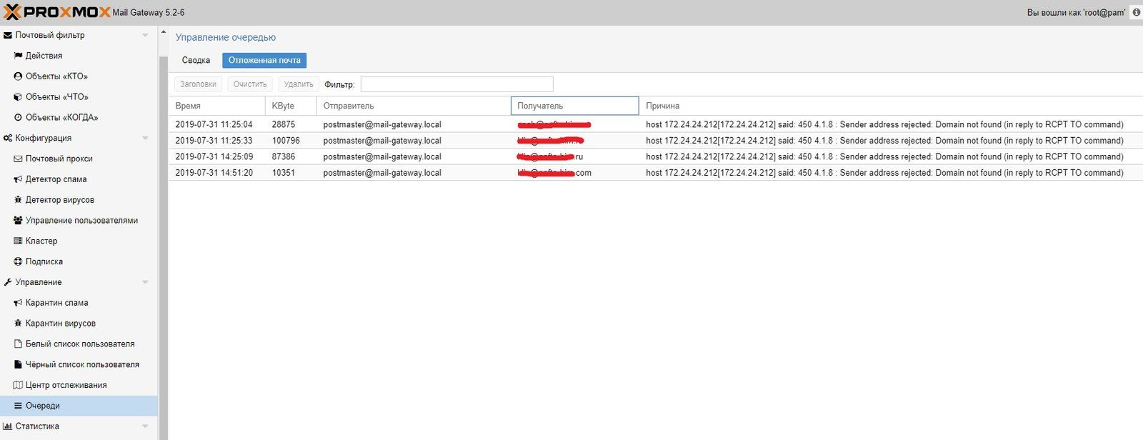 это что-то с маршрутизацией почты см. настройки, даже на картинке видать RCPT TO (т.е. получатель) не имеет правильного домена...