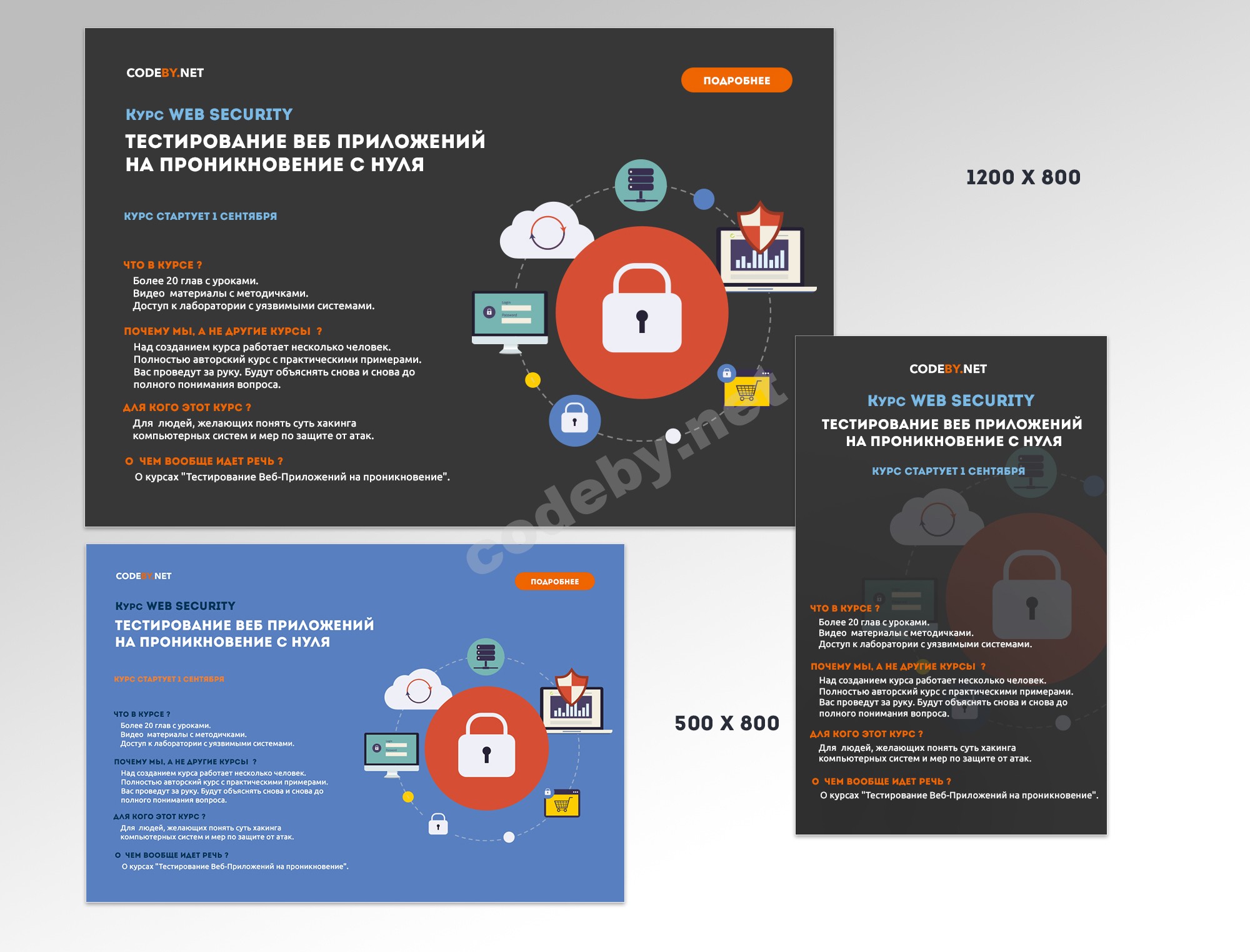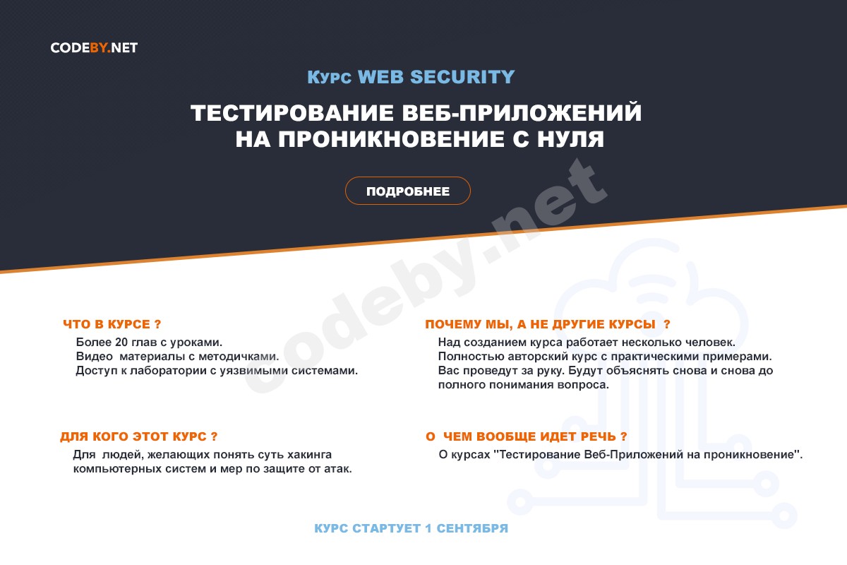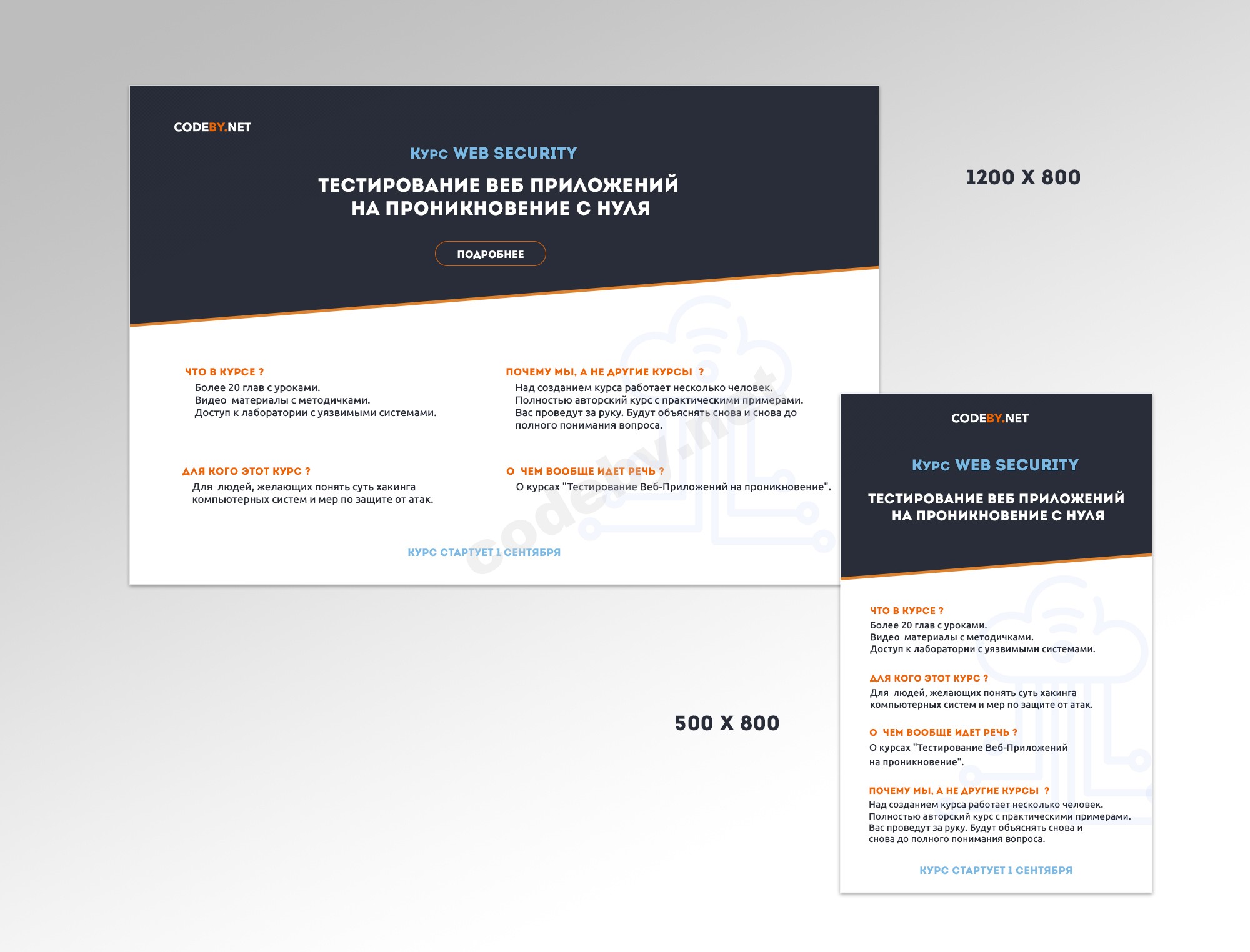 На картинке обязательно должен присутствовать логотип codeby.net в фирменном исполнении (шрифт, цвет). Задний фон картинки темно-серый. Использовать белый, оранжевый, золотой и светло-синий цвета. Должно быть краткое перечисление содержания курса (точнее его целей) - ключевые моменты, не более пяти строк. На картинке 1200*800 должна присутствовать кнопка действия: купить, подробнее и т.п. Два варианта размера: