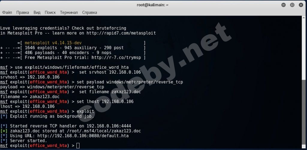 Метасплоит говорит что сохранил зараженный файл с именем zakaz180.doc и указывает его местоположение.