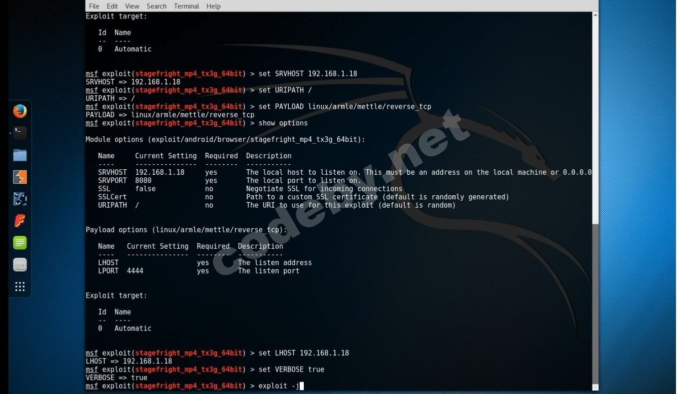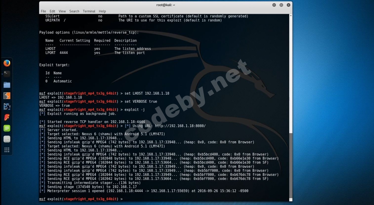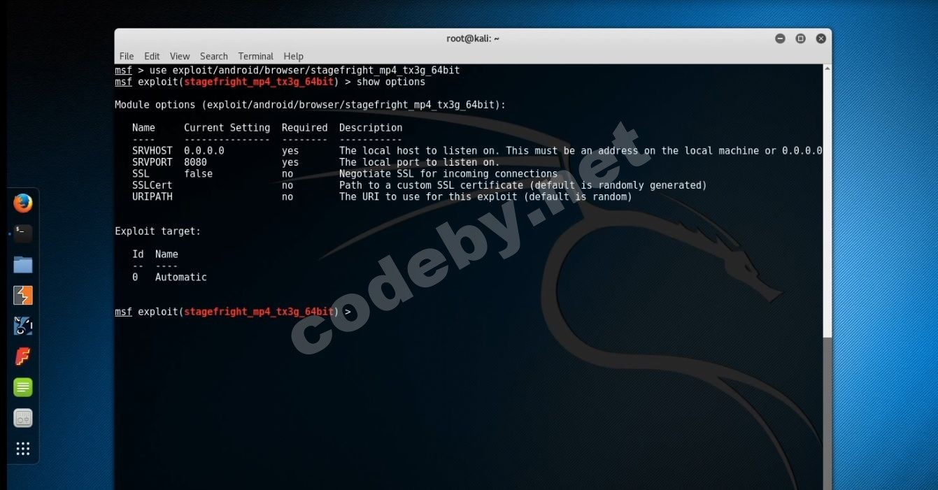 Для этого мы будем использовать эксплойт Stagefright. Запускаем метасплойт командой msfconsole.