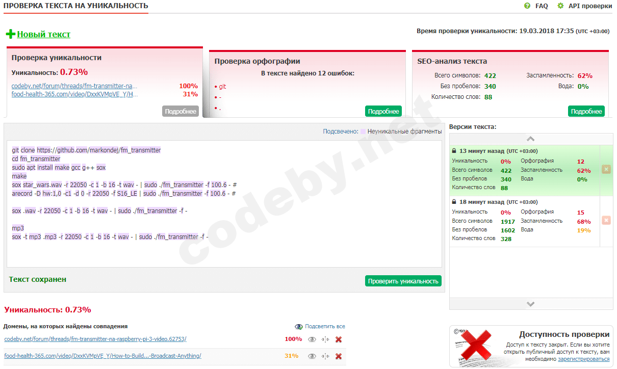 К тому-же изначальная претензия имела иную природу. Проблема в том, что как видно на предыдущем скрине, онлайн-сервис SEO-аналитики показал что 30% текста было продублировано с иного ресурса.