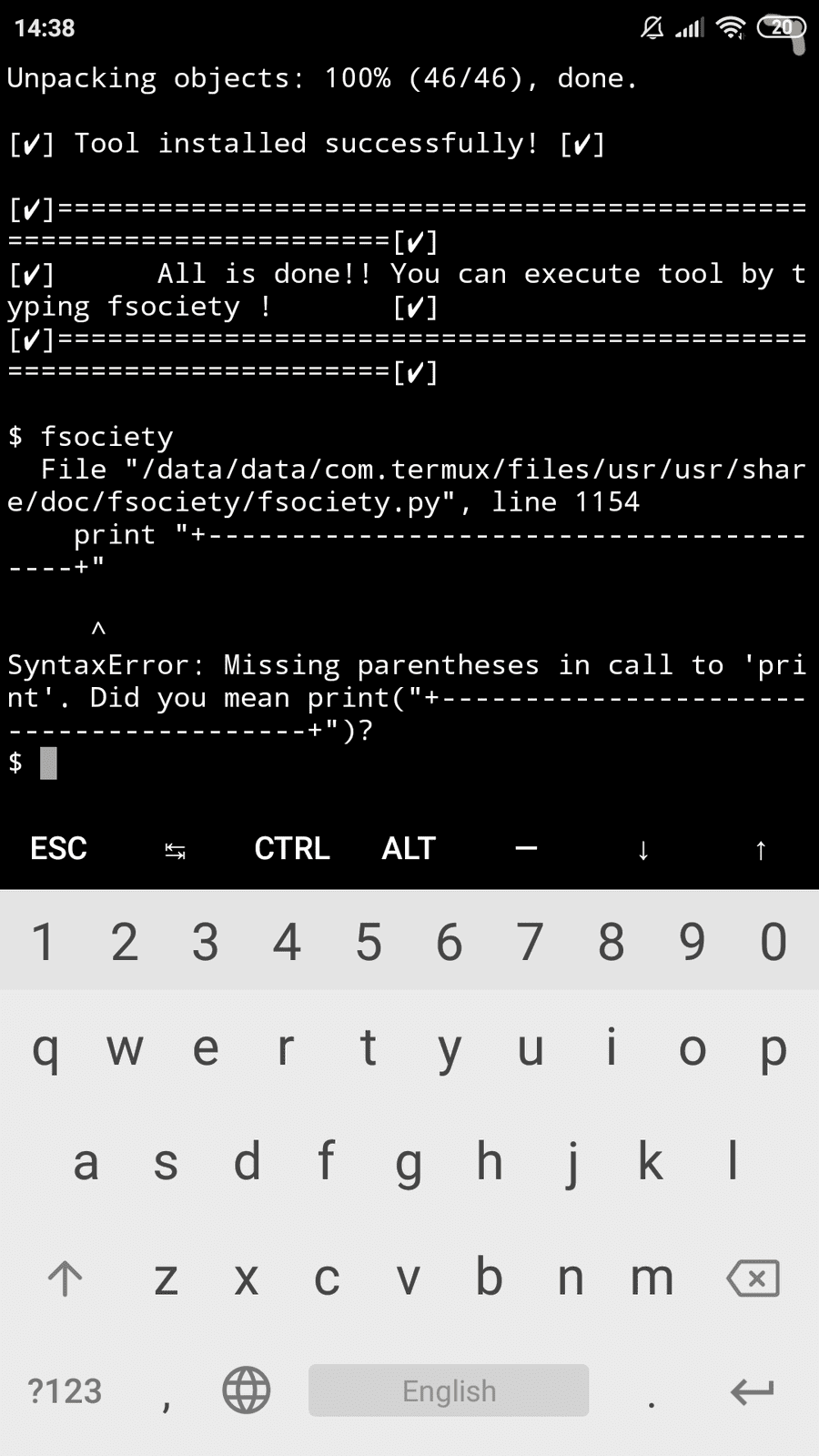 $ fsociety File "/data/data/com.termux/files/usr/usr/share/doc/fsociety/fsociety.py", line 1137 except(), message: ^ SyntaxError: invalid syntax
