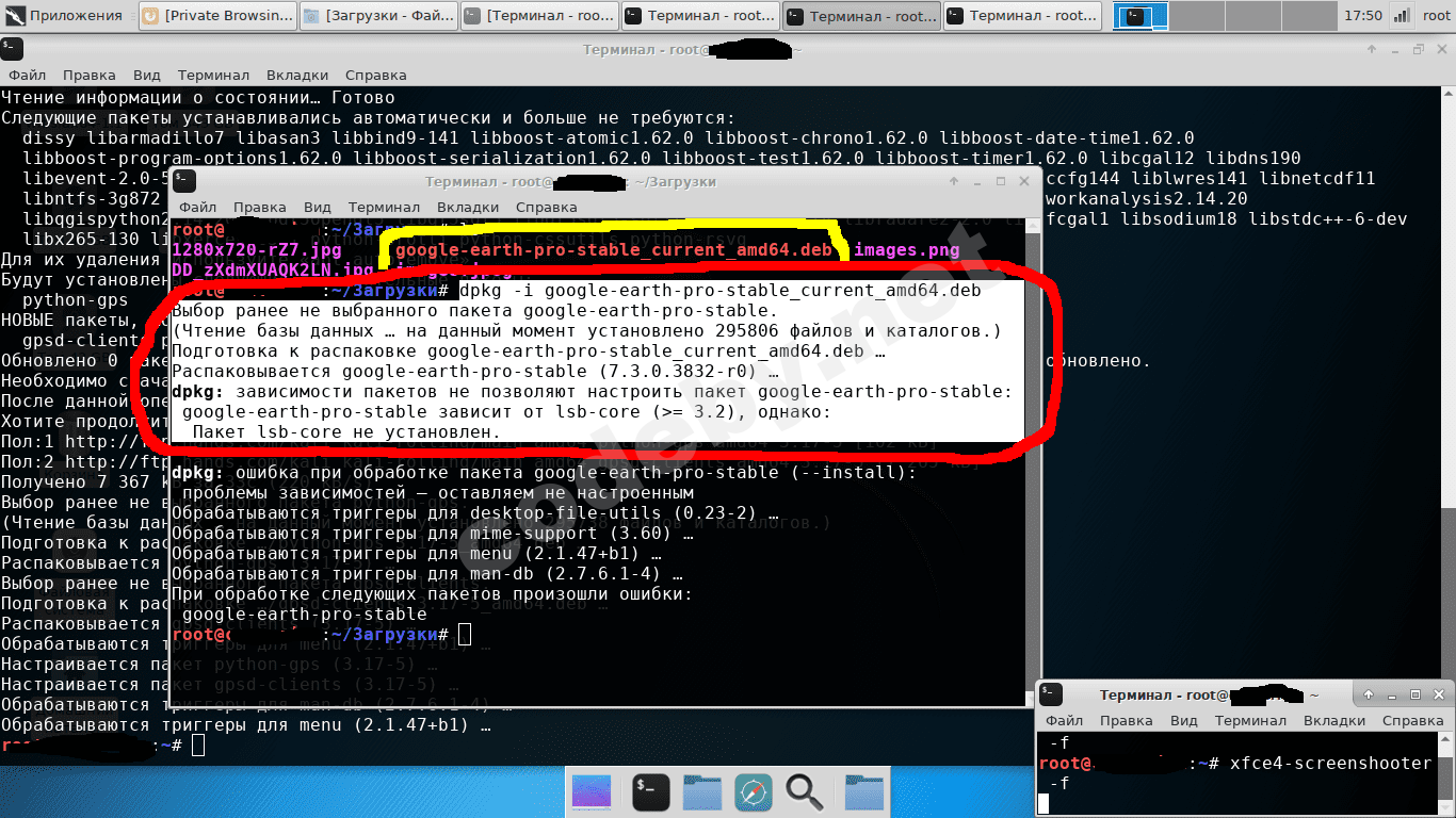 - dpkg -i Google earth........... и тд , но нам пишет ошибку , что не хватает одного составляющего для успешной установки , а именно lsb-core