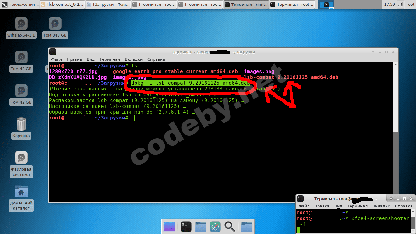 - по такой же схеме устанавиваем Google earth dpkg -i и название файла