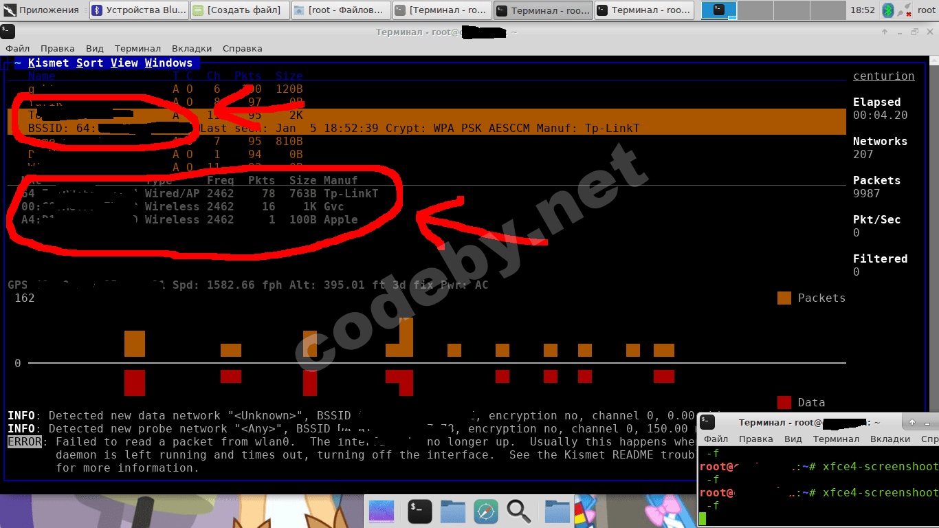 - пошел сбор данных о координатах , все это автоматом записывается в файл после закрытия Кисмета
