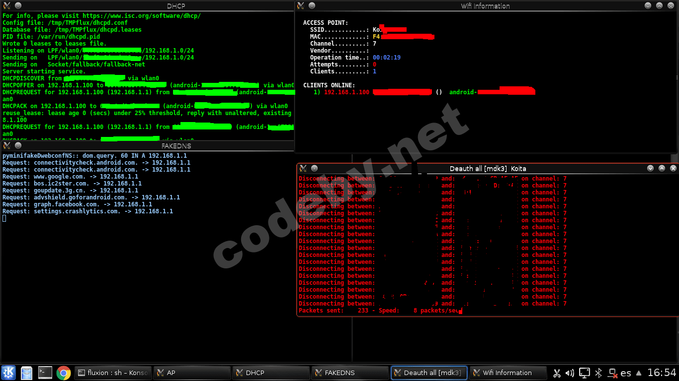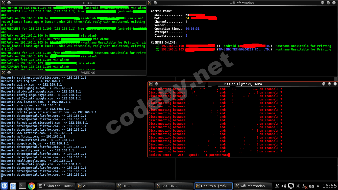 Fluxion - как известно скрипт позволяющий взламывать сети с помощью Социальной инженерии ( На**а в простонародье) ! Скрипт одновременно создает точку доступа , проводит деаунтификацию(разъединение , отключение) пользователей от настоящей точки , заставляя их устройства подключаться к нашей сети , также автоматом настраивает DHCP сервер и поддельный Днс перенаправляя пользователей при посещении любых сайтов в браузере на нашу страницу приказывая им ввести пароль . Для работы скрипт использует открытое програмное обеспечение