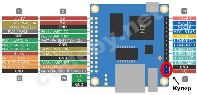 Allwinner H2+ очень горячая штучка, нагревается вплоть до 70 градусов и выше. При том, что процессор падает в тротлинг (сброс частот) ещё после 60-ти. При этом он перестаёт успевать обрабатывать данные от трансивера, и базовая станция вырубается. Охлаждение в нашей ситуации необходимо . Я прикрепил медный радиатор от Raspberry с термопастой, но и это не спасает на долго. Самым простым и эффективным решением будет кулер 5х5 см на всю плату + радиатор.