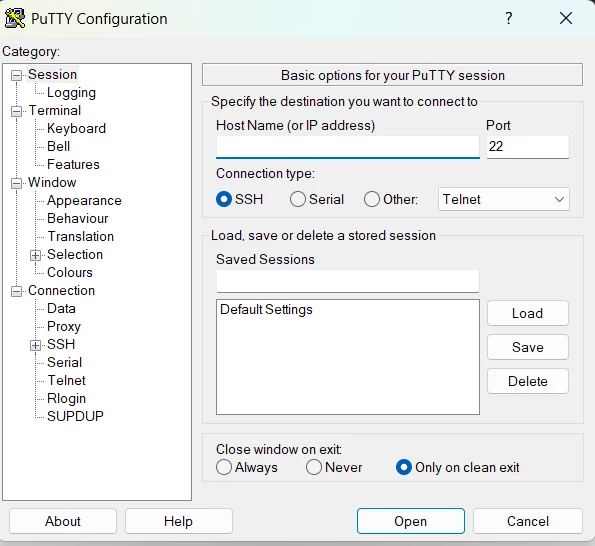 В поле Host Name вписываем ту же форму UserName@IPaddress и нажимае Open