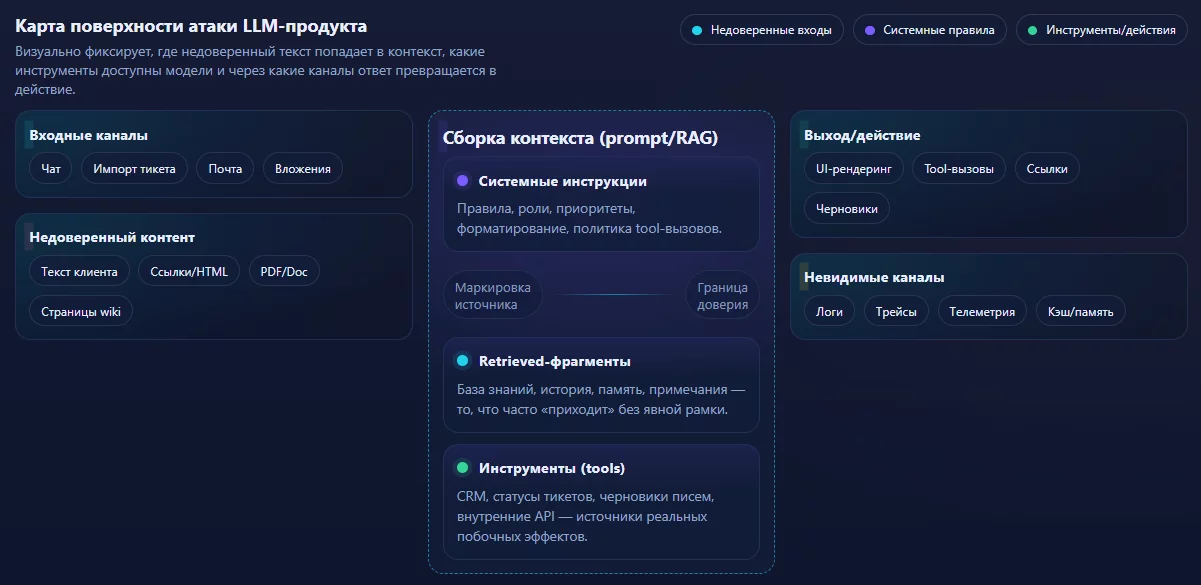 Scope разумно описывать как карту системы. Для условного помощника саппорта это включает входные каналы (чат, импорт тикета, почта), системные инструкции и шаблоны, контекстные источники (база знаний, вложения, история диалога, память), инструменты (CRM, статусы тикетов, черновики писем) и выходные каналы (UI‑рендеринг, ссылки, логирование, телеметрия). Особое внимание стоит уделять тому, где внешний текст попадает внутрь контекста, потому что именно там часто рождаются косвенные инъекции.В scope полезно сразу прописывать границы ответственности. Обычно тестируется безопасность продукта при заданной модели и заданной архитектуре, а не абстрактная “надёжность” самой модели как исследовательского объекта. Зато всё, что относится к маршрутизации запросов, фильтрации документов в retrieval, правам инструментов и контролю действий, обязательно должно считаться частью тестируемой поверхности.