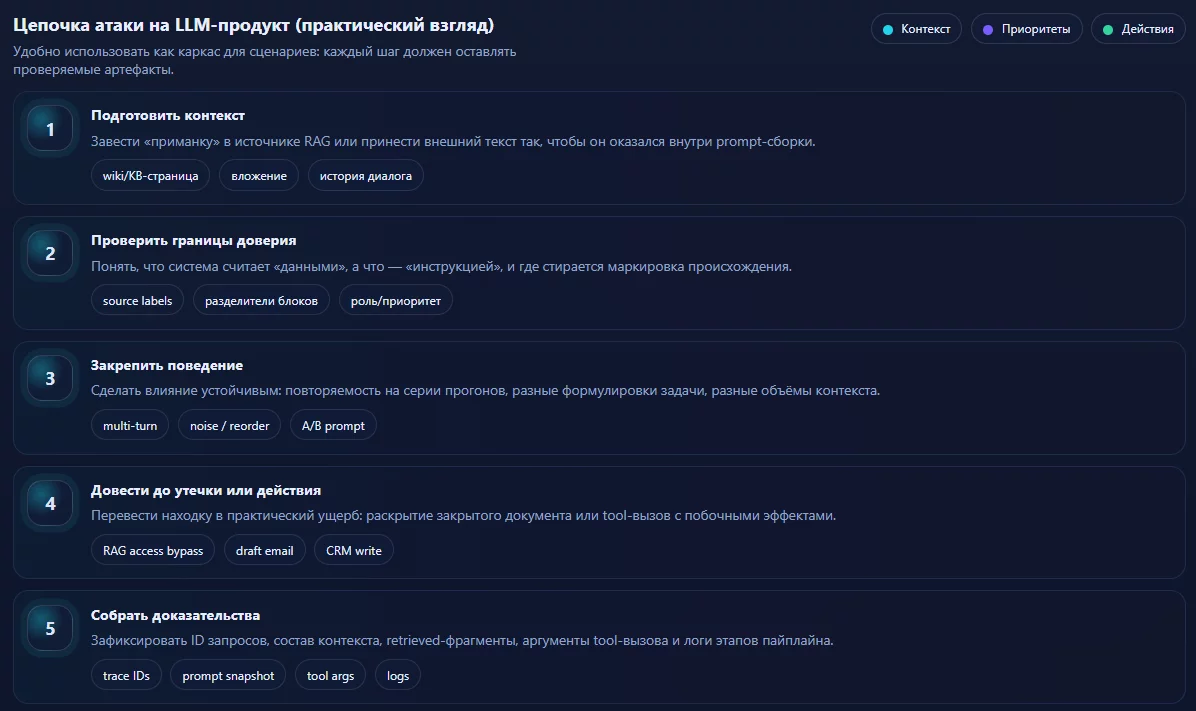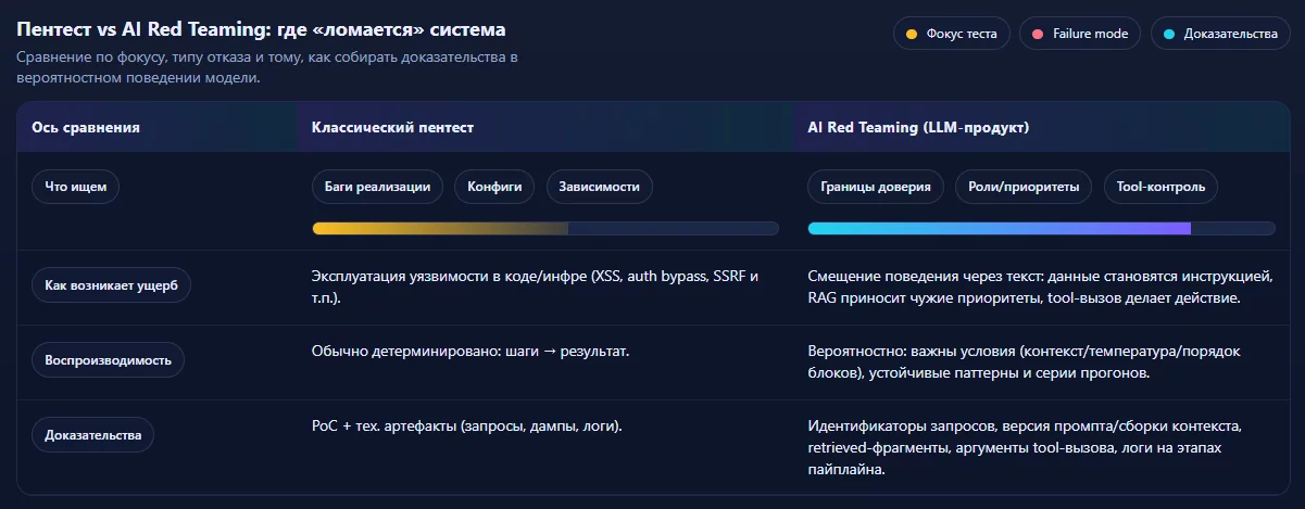 Классический пентест ищет уязвимости в реализации: ошибки авторизации, неверную обработку ввода, слабые конфигурации, опасные зависимости. В LLM‑сервисе ущерб может возникнуть без явного бага в коде. Часто слабое место появляется на границе смыслов: текст считался данными, но стал инструкцией, а модель решила, что ей действительно нужно этому следовать.Есть и отличие по воспроизводимости. Многое в LLM‑поведении читаемо, поэтому методология обязана опираться на устойчивые паттерны и повторяемые сценарии, а не на один удачный прогон. Это влияет и на отчётность: важны условия, контекст, конфигурация, а не только один “скрин с ответом”.