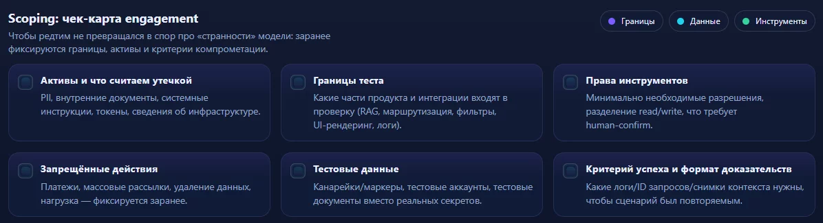 Scoping в AI red team - это наша практическая опора. Он нужен не ради отчёта, а чтобы заранее определить границы теста и критерии успеха: что считается компрометацией, какие активы защищаются, какие действия недопустимы, какие данные можно трогать только в тестовом виде. Без этих договорённостей редтим быстро превращается в спор о том, нормально ли конкретное “странное” поведение модели.Что входит в scope