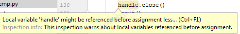 Код может и с ошибками работать, зависит от типа ошибки. Ошибка следующая - нужно ссылаться на локальную переменную "handle" перед присвоением