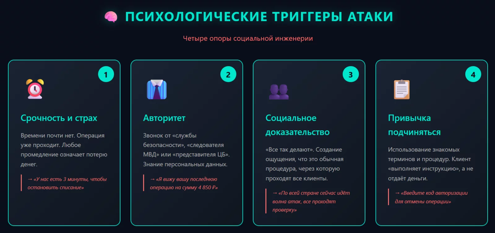 Причины выбора банков в качестве главной цели очевидны, но важно проговорить их именно с человеческой стороны. Деньги находятся очень близко к эмоциям. Любое сообщение о потенциальной потере средств мгновенно включает тревогу, страх и желание «немедленно что‑то сделать». Это идеальный эмоциональный фон для манипуляций.К этому добавляется традиционно высокий уровень доверия к банкам как к институту. Если голос в трубке или письмо в почте успешно имитирует атрибуты банка — номер, терминологию, знание операций и персональных данных, — доверие включается автоматически. Клиенту в принципе сложно поверить, что с ним говорит не «настоящий банк», если всё вокруг выглядит именно так.