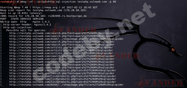 > nmap -sV –script=http-sql-injection www. testphp.vulnweb.com –p 80