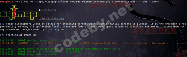 Теперь введите следующую команду для сканирования цели на возможность проведения SQL инъекций.