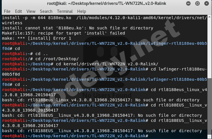 make ARCH=x86_64 CROSS_COMPILE= -C /lib/modules/4.13.0-kali1-amd64/build M=/root/kernel/drivers/TL-WN722N_v2.0-Ralink/lwfinger-rtl8188eu-00b5f0d modules make[1]: *** /lib/modules/4.13.0-kali1-amd64/build: Нет такого файла или каталога. Останов. Makefile:151: ошибка выполнения рецепта для цели «modules» make: *** [modules] Ошибка 2