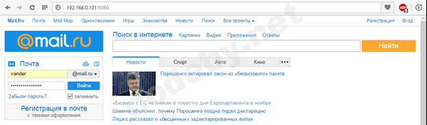 Теперь, при обращении к серверу по адресу, в моем случае это 192.168.0.101:8080, мы попадаем на фишинговый вариант сайта mail.ru, внешне ничем не отличается: